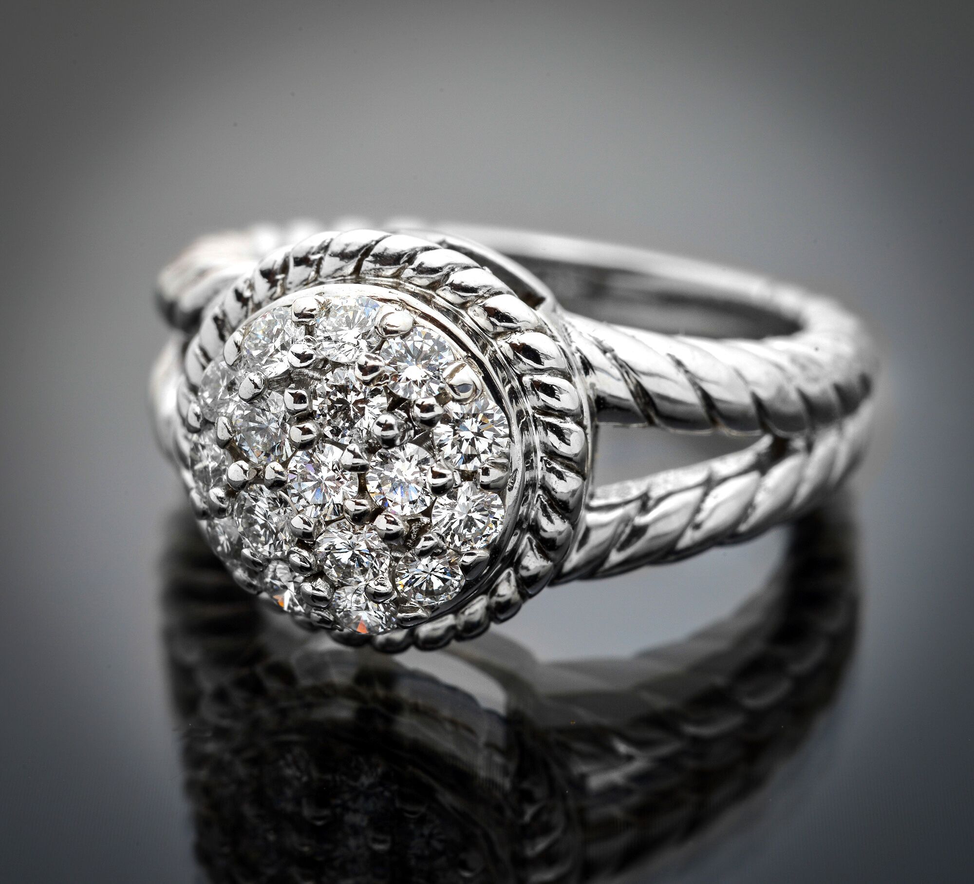 This braided design diamond ring features seventeen round brilliant diamonds having an approximate total weight of .59 carat. The exquisite design of this ring is showcased by its braided outer halo and twin shanks. The ring is shown in 14K white gold and is also available in platinum or 14K yellow gold.