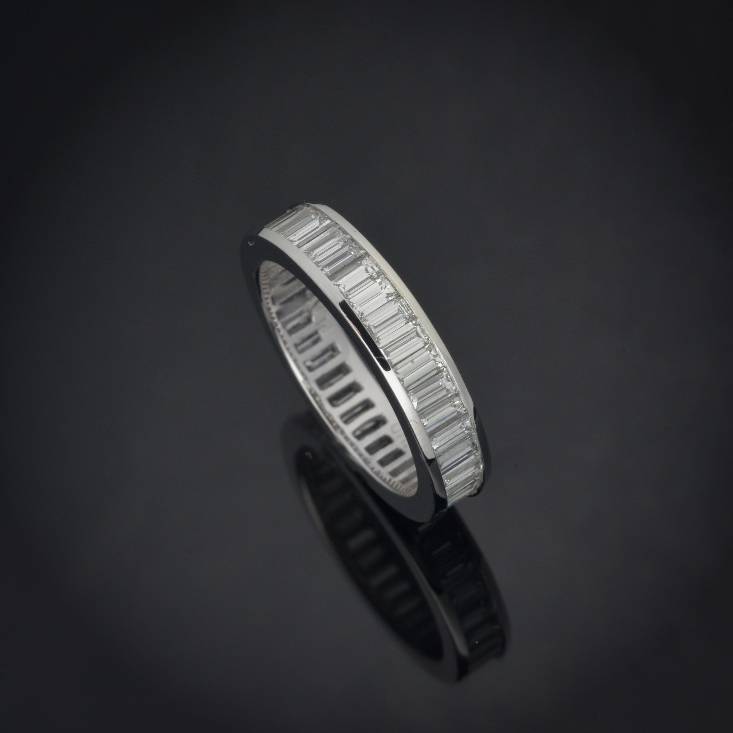 Lady’s diamond baguette eternity ring featuring forty straight channel set diamond baguettes having an approximate total weight of 2.35 carat. The band is shown in platinum and is also available in 14K white or yellow gold and additional total carat weights. Total carat weight and total number of diamonds is based on standard finger size 6.