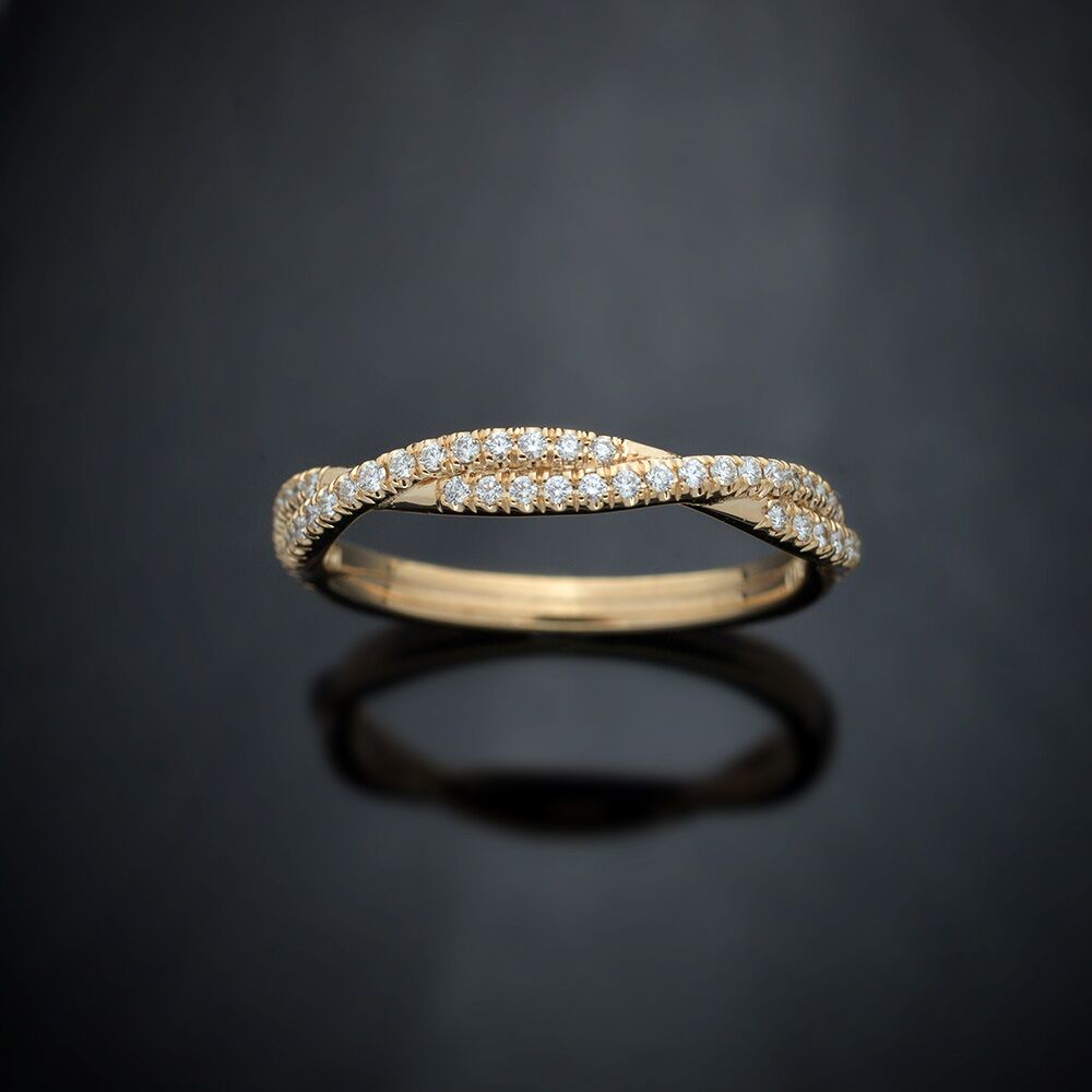 This lady’s diamond weave wedding ring features forty-eight round brilliant diamonds having an approximate total weight of .25 carat. The intricate weave of this custom made diamond wedding ring showcases the beauty of the its delicately set diamonds. The ring shown in 14K yellow gold is also available in platinum or 14K white gold.