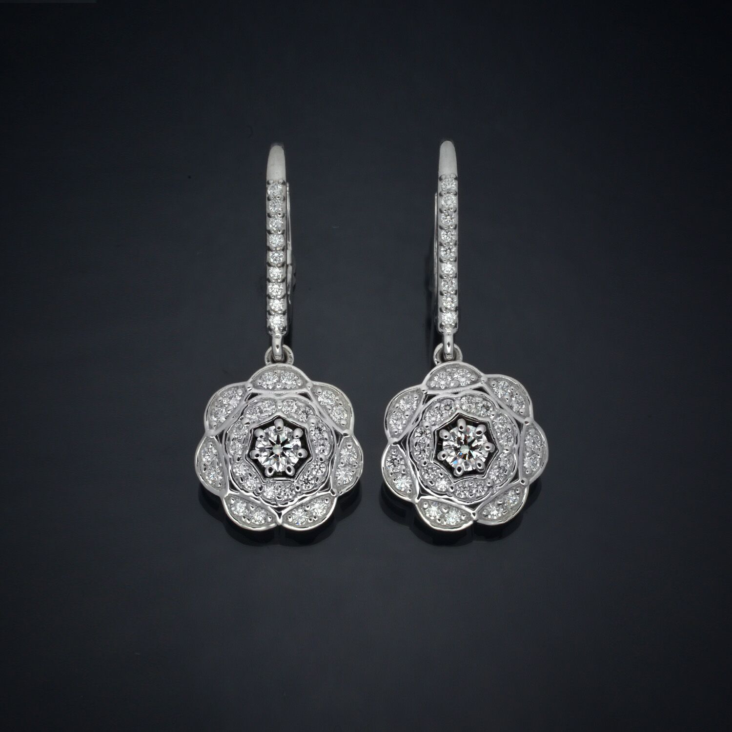 Double Halo Diamond Lever Back Earrings in 14K White Gold