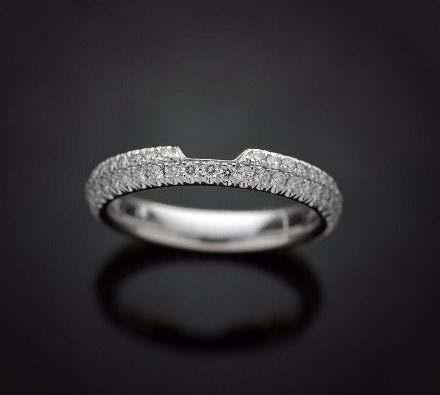This lady’s matching diamond wedding ring features eighty-four round brilliant diamonds having an approximate total weight of .54 carat. The ring finely crafted in platinum is designed to exact specifications to match the contour of the customer’s existing engagement ring. The ring is also available in 14K white or yellow gold.