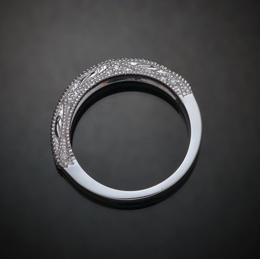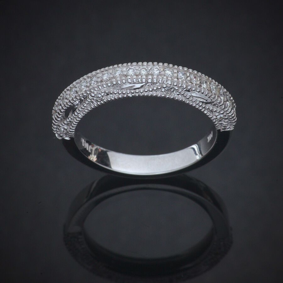 Lady’s milgrain diamond wedding ring with side diamond accents featuring twenty-eight round brilliant diamonds having an approximate total weight of .24 carat. The ring finely crafted in 14K white gold has one row of diamonds framed by milgrain detail that also borders the diamond accented sides. The ring is also available in platinum or 14K yellow gold.