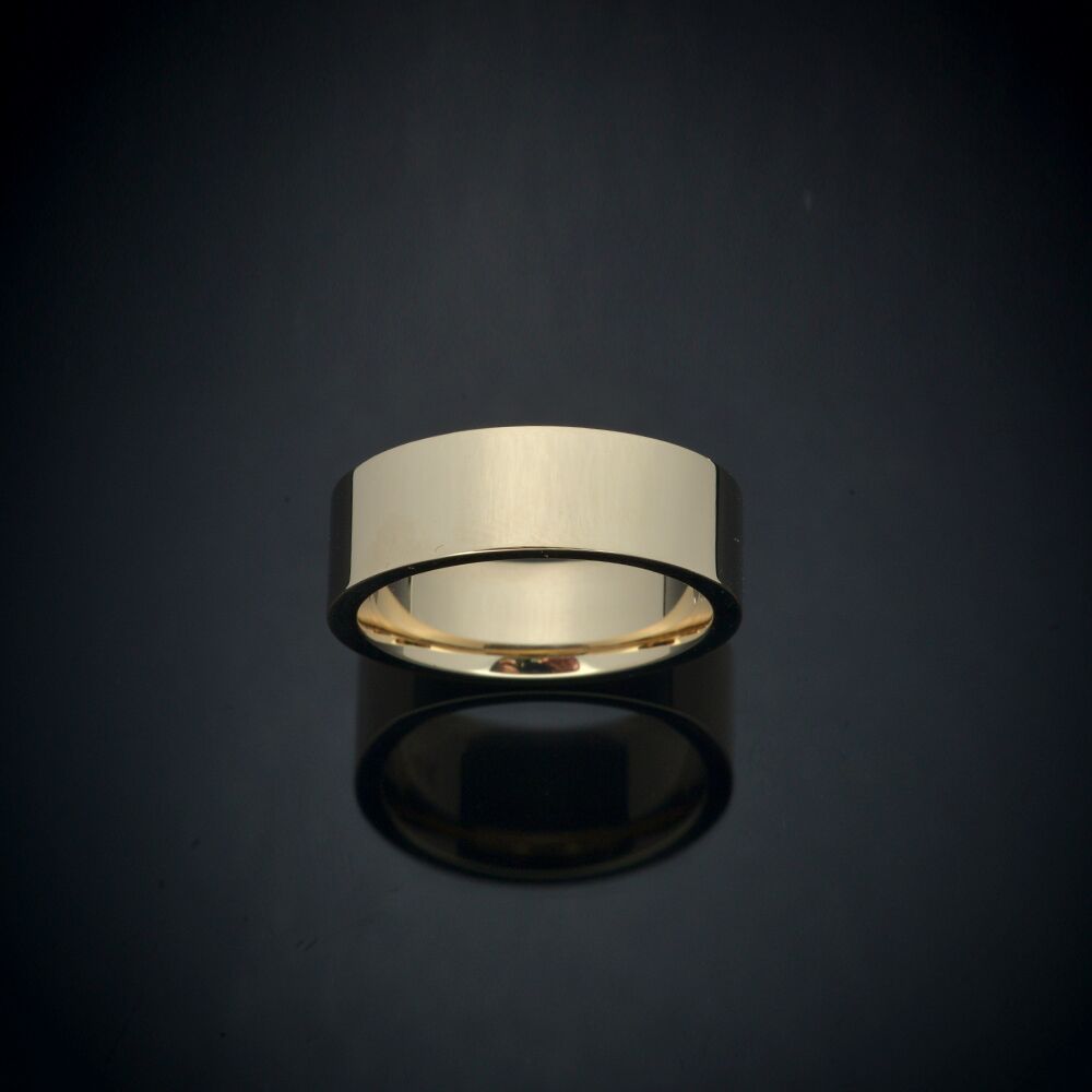 This men’s square edge 14K gold wedding ring is crafted in 14k yellow gold with a comfort fit interior and bright polish finish. Rounded inner edges create a comfortable everyday wear. This ring is also available in platinum or 14K white gold and additional widths and finishes.